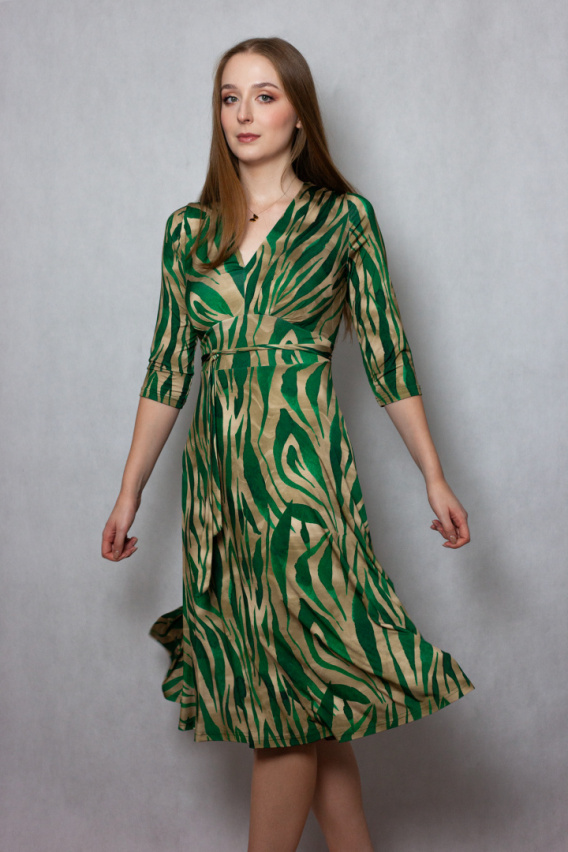 Ta sukienka to wyjątkowy model o długości midi, idealny dla kobiet ceniących oryginalne wzory i elegancję. Utrzymana w odcieniach zieleni i beżu, zdobiona jest motywem przypominającym liście lub pasy zebry, co nadaje jej egzotyczny i wyrazisty charakter. Sukienka posiada kopertowy dekolt w serek, który subtelnie podkreśla dekolt, oraz rękawy 3/4, co zapewnia wygodę i elegancję w noszeniu. Talia zaznaczona delikatnym paskiem pięknie modeluje sylwetkę. To doskonały wybór na letnie wyjścia, wieczorne kolacje czy casualowe spotkania, gwarantujący komfort i styl w jednym.